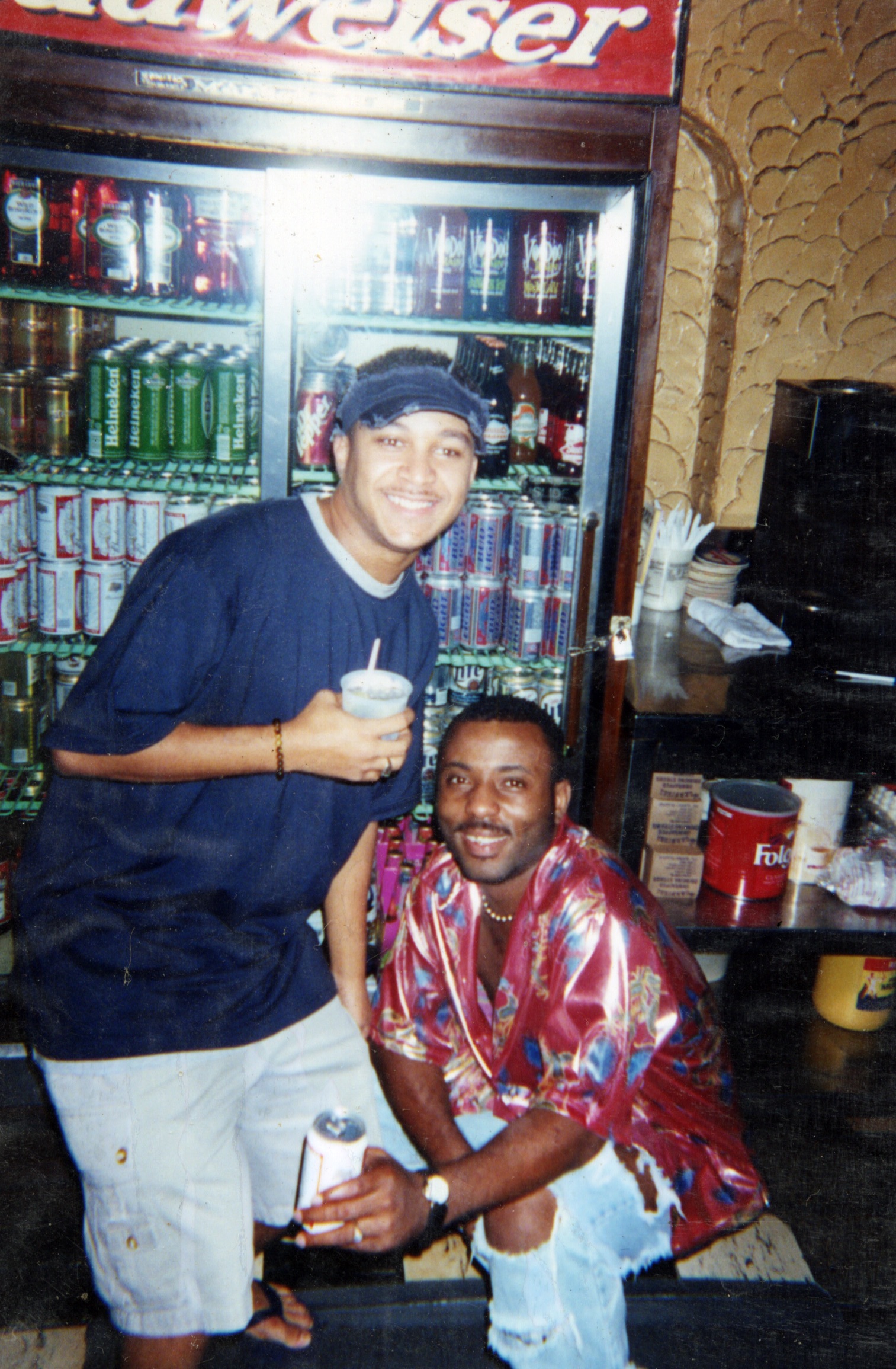- Danny Cashmere (right) kneels in front of the fridge at Soakie's with his peer, Kermit (left). Danny wears a satin, pink-patterned shirt and ripped blue jeans and holds a beverage in his left hand.