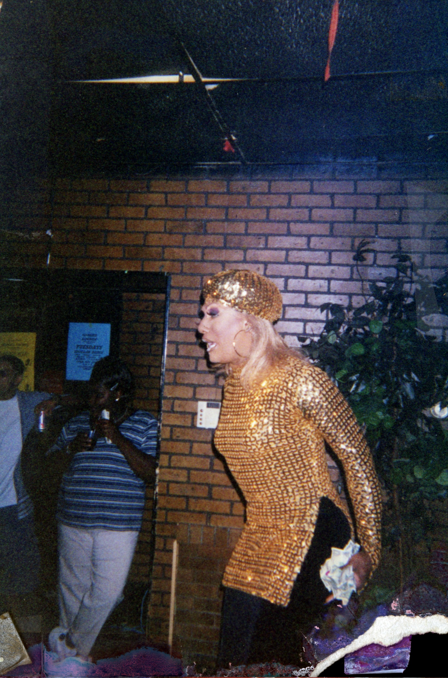 - China Collins performs in the upper level of Soakie's. China dons a matching sparkly gold long-sleeve and cap.