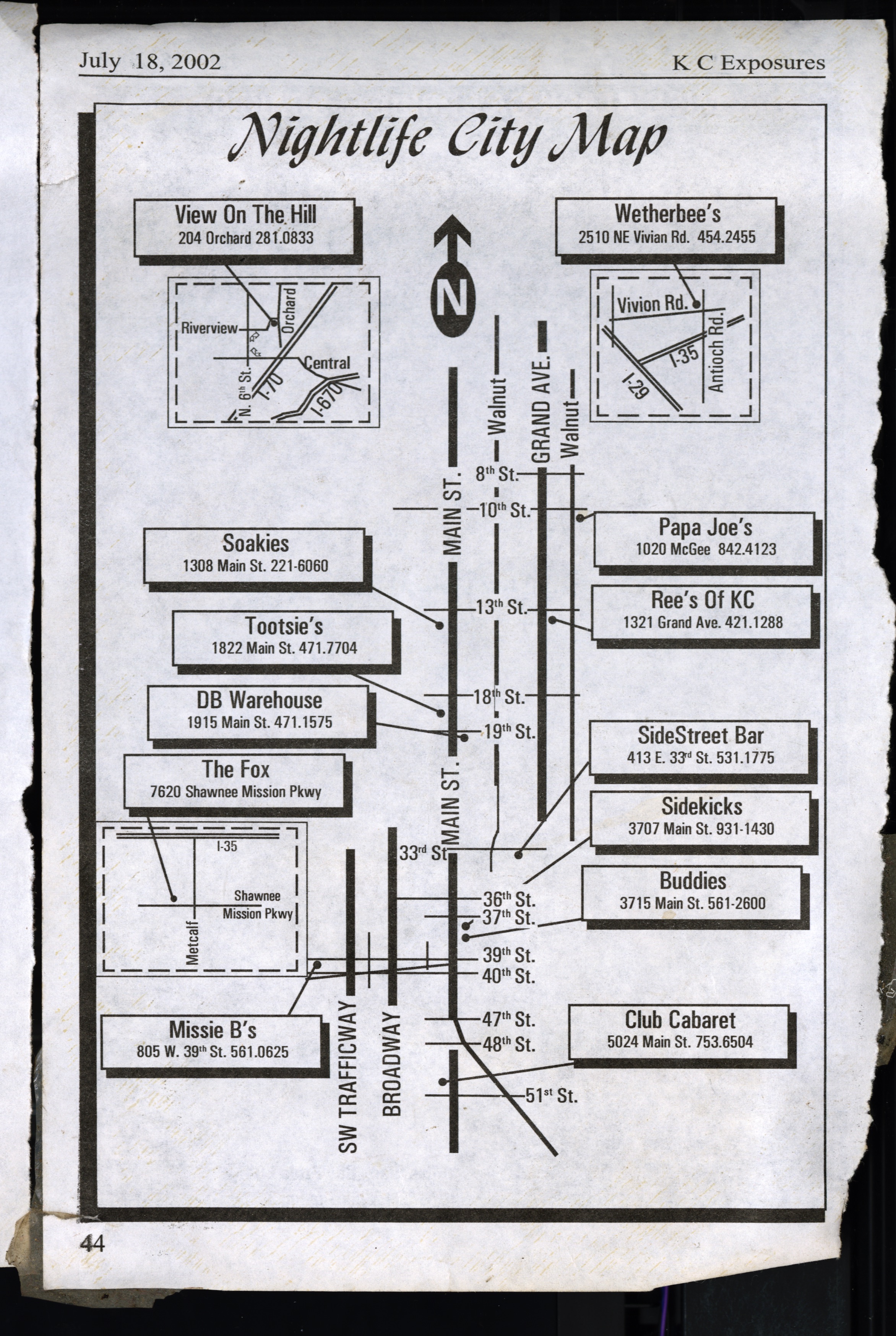 - A map of gay bars in Kansas City, created by weekly gay circular K.C. Exposures, published on July 14, 2002. 13 total bars are on the map.